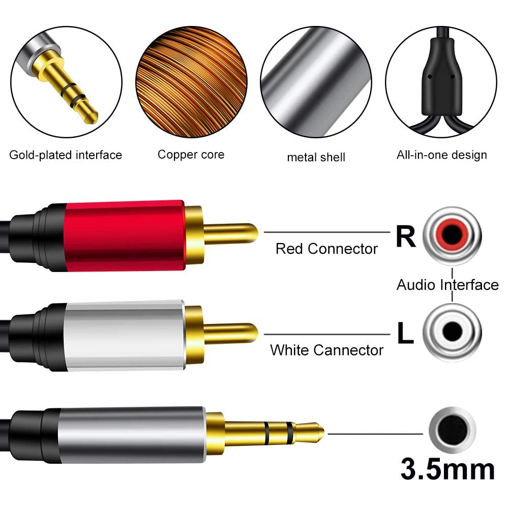 - PREMIUM CONNECTORS – AUX splitter connectors have different colors 3.5mm audio cable: grey, phono cable: red & white. SHELL: Aluminum sandblasting gray. Polished Male to Male 3.5mm to RCA (2 x phono) Y splitter stereo aux cable. Oxidation and corrosion resistant 3.5mm 3-pole gold-plated male head + gold-plated 2 x RCA male head.